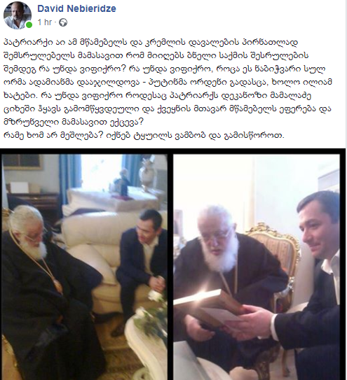 “პატრიარქი აი ამ მწამებელს და კრემლის დავალების პირნათლად შემსრულებელს მამასავით რომ მიიღებს ბნელი საქმის შესრულების შემდეგ რა უნდა ვიფიქრო? რა უნდა ვიფიქრო, როცა ეს ნაბიჭვარი სულ ორმა ადამიანმა დააჯილდოვა – პუტინმა ორდენი გადასცა, ხოლო ილიამ ხატები. რა უნდა ვიფიქრო როდესაც პატრიარქს დეკანოზი მამალაძე ციხეში ჰყავს გამომწყვდეული და ქვეყნის მთავარ მწამებელს ეფერება და მზრუნველი მამასავით ექცევა?