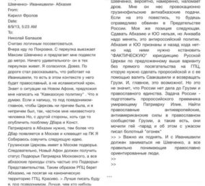 მიმოწერის მიხედვით, ვინმე კირილ ფროლოვი რუს სასულიერო პირს, ნიკოლაი ბალაშოვს უგზავნის ბირსკისაგან მიღებულ წერილს. მასში არის ერთგვარი ისნტრუქცია იმაზე, თუ როგორ უნდა დაამხონ ხელისუფლება საქართველოში, საპატრიარქოსა და რუსი სასულიერო პირების მონაწილეობით. ნახსენებია რუსი ჟურნალისტი მაქსიმ შევჩენკოც, რომელიც ამავე წერილის მიხედვით, „ივანიშვილზე მუშაობს“.
